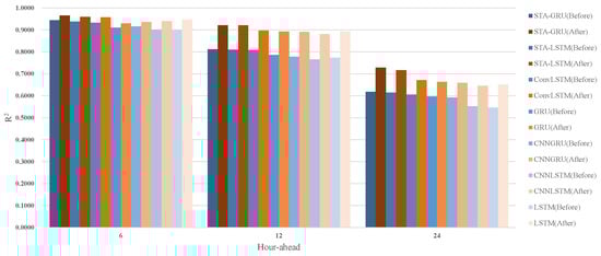Moreover, the most pronounced dip in performance is observed in the models between the 12th and 24th-h forecasts—a decline of 0.2. This might hint at challenges the models face in accommodating certain temporal shifts or cyclic patterns beyond the 6-hour mark. As we progress through the forecast horizon, certain models witness a steeper attrition in performance. Case in point, the CNNLSTM’s value plummets from 0.90 (at 6 h) to 0.55 (at 24 h)—a descent markedly steeper than the STA-GRU’s slide from 0.93 to 0.61. Typically, a slower decline in a model’s over the forecast period is emblematic of its generalization prowess and stability. Gauging from the data at hand, STA-GRU and STA-LSTM emerge as frontrunners in this regard. In addition, The foundational GRU and LSTM models show perceptible performance disparities compared to their advanced counterparts like STA-GRU and STA-LSTM. This indicates the tangible benefits brought about by sophisticated features such as spatial attention.