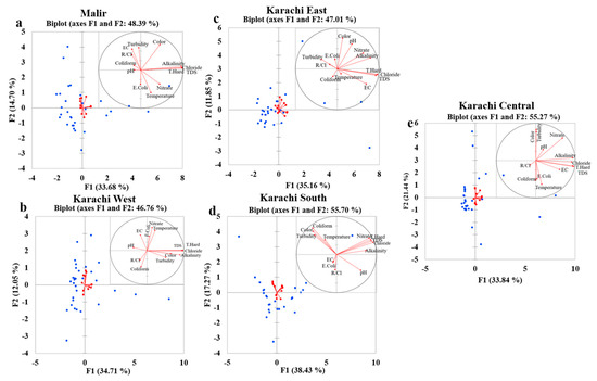 Principal Component Analysis (PCA) of physicochemical and biological parameters of drinking water samples collected from different districts of Karachi. (a) Malir with biplot (axes F1 and F2: 48.39%); (b) Karachi West with biplot (axes F1 and F2: 46.76%); (c) Karachi East with biplot (axes F1 and F2: 47.01%); (d) Karachi South with biplot (axes F1 and F2: 55.70%); (e) Karachi Central with biplot (axes F1 and F2: 55.27%). The loadings of the variables, eigenvectors, in blue while the parameters in red dots with labels are shown, in relation to the first two components (F1 and F2).