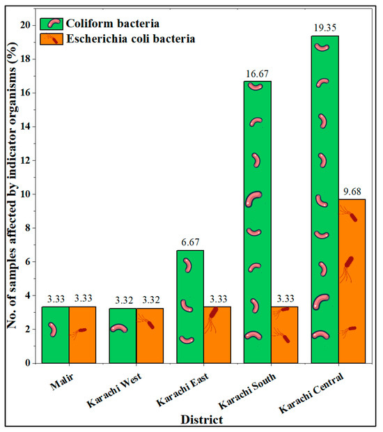 The overall percentage of coliform and E. coli was evaluated in each district (Figure 3). District Malir and Karachi West were observed to have equal percentages of each of two bacteria (3.33% and 3.32%), while the same percentage of the presence of E. coli was observed (3.33%) in District Karachi East and South along with 6.67% and 16.67% of coliform bacteria. District Karachi Central was found to have the highest percentage of coliform and E. coli bacteria, i.e., 19.35% and 9.68%. The presence of indicator organisms (coliform and E. coli) in drinking water reveals that the water source has encountered sewage or other sources of contamination resulting in waterborne diseases, including gastrointestinal illnesses [46,47].