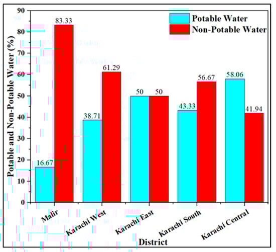 where Na is the total number of affected samples, and N is the total number of samples in each district. The potable and non-potable water percentage in each district of Karachi was calculated using Equation (3).