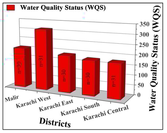 Table 6 displays the classification of water quality proposed by [48] on the basis of water quality index (WQI) values, including water quality status (WQS) and water quality grading (WQG). Figure 5 reveals the water quality status (WQS) in the study area with a value of <100 in each district, i.e., 207, 312.2, 189.7, 176.9, and 176.1 for District Malir, Karachi West, Karachi East, Karachi South, and Karachi Central unfit for consumption. The WQS values below 100 in the mentioned districts indicate that the water quality is substandard and unsuitable for consumption. These results underscore the importance of addressing water quality challenges and implementing measures to provide safe and healthy drinking water to the residents of these districts. The results in Figure 5 emphasize the need for immediate attention and action to address the water quality issues in these districts. This could involve water treatment, source protection, infrastructure upgrades, and public health measures to ensure safe and clean drinking water.