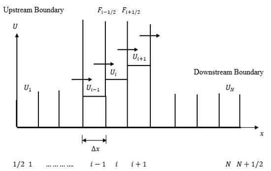 The Finite Volume technique is utilized in solving hyperbolic equations using a Godunov-type algorithm [,,,,,]. The first-order Godunov approach assumes the average value of over each cell at a time level to be known and the average value of over each cell at the next time level is to be found. However, the distribution of over the cell is unknown. The reconstruction step consists of guessing the distribution of within the cell at the time level . Therefore, the value in each cell is presumed to be constant in this approach. But in the second-order Godunov scheme, a linear value, rather than a constant value, is presumed in each cell. The reconstruction of cell values was utilized in the second-order Godunov scheme. A straight line with a given slope is used to represent the reconstruction in the (Monotonic Upstream-centered Scheme for Conservations Laws (MUSCL)-Hancock scheme). The solution is implemented to calculate the flux through the cell interface and there is a need for a proper limiter function to maintain the cell value within the limit.