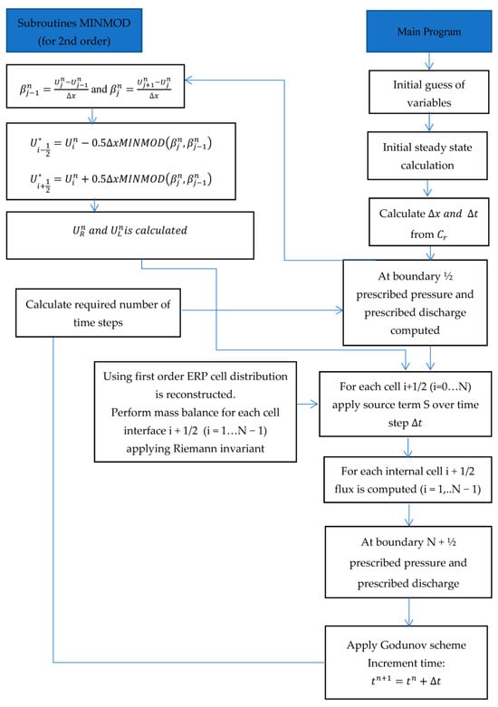 where is the average value of to the left of interface at and is the average value of u to the right of interface at . A polynomial reconstruction approach is used to estimate and whose order defines the accuracy of the numerical scheme. In Godunov’s first-order accuracy approach, the condition and is used. In the second-order Godunov scheme, the MUSCL-Hancock scheme is introduced [,,] The MINMOD limiter is recommended to stop false oscillations, the features of which are found in Toro []. Figure 2 shows a flow chart of the second-order Godunov method for water hammer modelling with the MINMOD limiter; however, it can be replaced with any other limiter.