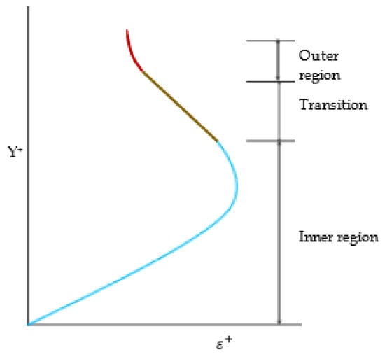 Both the eddy viscosity and mixing length models match well. The inner region uses the mixing length model and the outer region uses the eddy viscosity model. The distribution of the eddy viscosity is shown in Figure 3. The computation of the mixing length distribution is necessary for the computation of the eddy viscosity. The equation showing the relation between eddy viscosity and mixing length [] is given as follows: