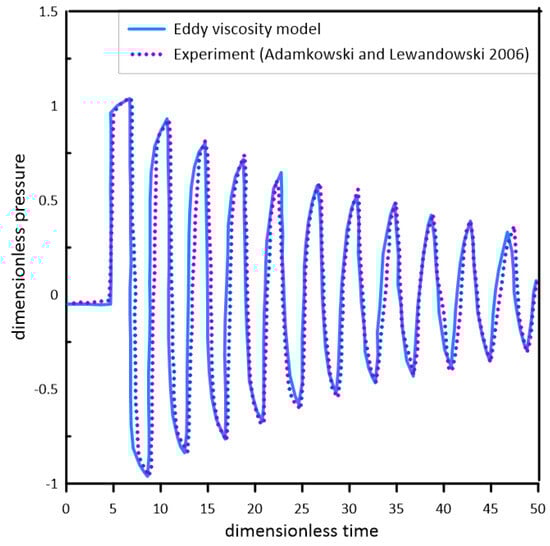 The more details about the quasi 2D eddy viscosity model is found in Silva-Araya and Chaudhry []. Hanmaiahgari and Maji [] evaluated the performance of the eddy viscosity model during sudden valve closure and validated it with the experimental measurements of Adamkowski and Lewandowski []. They compared the pressure profiles at the downstream end of pipelines for the initial flow velocity m/s and compared these with the experimental data, as shown in Figure 4. The dimensionless pressure and dimensionless time were represented by and respectively.