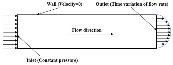 where is the fluid density, and are the velocity components, is the time, is the pressure, and is the fluid dynamic viscosity. For turbulent flows, the Reynolds stress tensor is modelled using a turbulence model, but it disappears for laminar flows. It is not required to solve the energy equation during the water hammer calculations since the variation in temperature is insignificant [,,]. The compressibility effect is taken into consideration during the simulation, and the relationship is expressed as