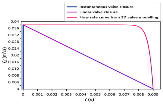 Yang et al. [] used a 3-D computational fluid dynamics model with the sliding mesh method for modelling water hammer and compared those results with 1-D MOC calculations based on unsteady friction models. The results also demonstrated that sliding mesh is a reliable technique for simulating the rapid closing of rotating ball valves. Saemi et al. [] investigated 3-D numerical simulation for laminar and turbulent water hammer flow which utilized a sliding mesh approach for closing the valve. In this study, the axisymmetric model was also used in which the flow rate reduction was used as an outlet boundary condition. However, compared with the axisymmetric simulations, 3-D CFD simulations using sliding mesh provided accurate pressure variation results; however, they required vast computational resources. The sliding mesh technique was utilized to realize the rotation process of the ball valve to analyse the impact of various closing laws and closing times on the water hammer []. Cao et al. [] developed a 3-D CFD model to study the 3-D dynamic features of the ball valve closure. The ball valve closure was accomplished by utilising the sliding mesh technique. It was observed that during the closing operation, mean velocity variations and differential pressure at the valve underwent three different stages. The axial motion of a thin gate valve can be modelled as a mesh movement without any deformation using the sliding mesh technique []. This approach predicts more accurate outcomes that are closer to the experimental measurements. The sliding mesh is the most preferred approach for valve closure modelling in the literature as they are less expensive and present more accurate results.