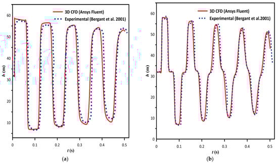 Comparison of pressure head () variation with time ( between CFD simulations and experimental data []: (a) at valve (b) at the midpoint of the copper pipeline.