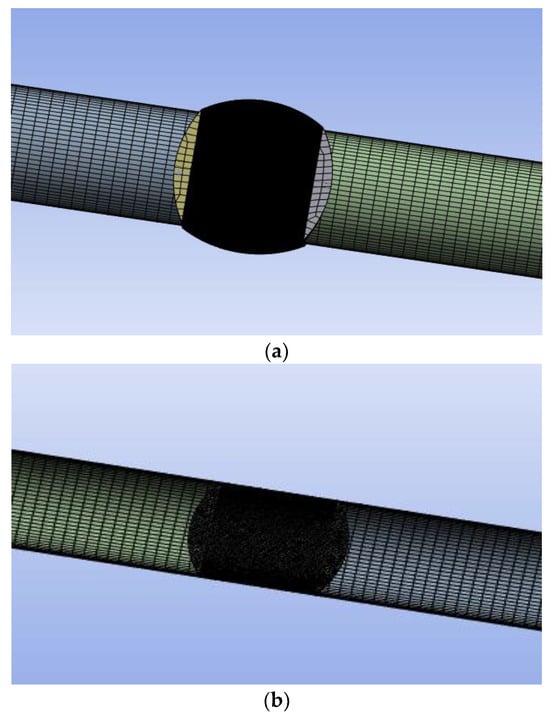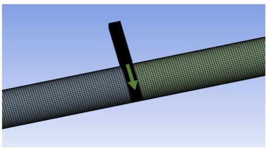 In this approach, the domain used to model the valve body is known as an immersed solid domain. The solid domain is immersed into the fluid region represented by the pipe indicating the valve closure process shown clearly in Figure 11b. In the overlapping of solid and fluid regions, the immersed solid technique introduces a source term in the momentum equation to force the fluid velocity to match the velocity of the immersed solid. Kalantar et al. [] employed the immersed solid method for modelling the valve closure to study the pressure-time method during the water hammer phenomenon. The study showed that there could be a chance for the leaking of water through the immersed solid as the valve starts closing. Neyestanaki et al. [] presented and compared various methods for axial valve closure in a 3-D water hammer simulation. The result showed that the immersed solid approach underestimates differential pressure rise and overestimates wall shear stress close to the end of valve closing due to a lag in discharge reduction. In the case of axial valve motion, the immersed solid approach is easier and preferable to the dynamic mesh approach because the need for mesh deformation and re-meshing is eliminated in the method [,].