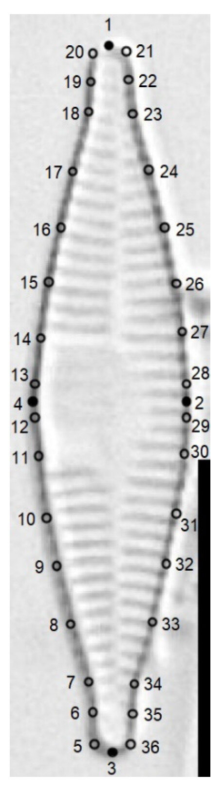 Figure 1. LM image of Fragilaria sublanceolata-baikali showing the position of the 4 landmarks (filled circles No. 1–4) and the 32 semilandmarks (unfilled circles No. 5–36) on the valve outline used to perform the morphometric analysis. Scale bar: 10 μm.
