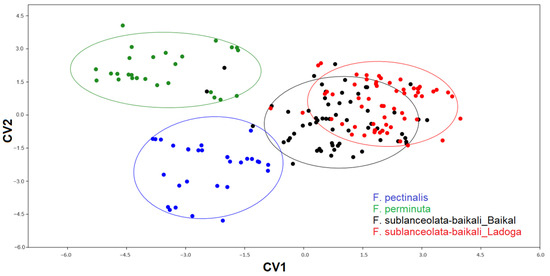 For traditional morphometrics, canonical variate analysis (CVA), also known as discriminant analysis for multiple groups, was performed to test the separation between Fragilaria populations on the base of morphometric characteristics in the PAST software ver. 4.13 [44]. CVA provided an ordination that maximized the separation between the group means relative to the variation within groups. All morphometric variables were log-transformed.