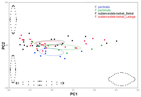 Figure 12. Plot of the principal component analysis (PCA) for different Fragilaria populations (red circles = F. sublanceolata-baikali sampled in Lake Ladoga; black circles = F. sublanceolata-baikali sampled in Lake Baikal; blue circles = F. pectinalis; green circles = F. perminuta). Variation around the means is illustrated with 90% confidence ellipses. Illustrations inside the plot represent approximations of the extremes of the first two principal components (PC1–2).