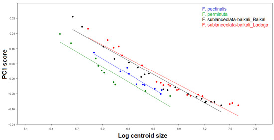 Figure 13. Plot of the first principal component (PC1) scores versus log centroid size for different Fragilaria populations. Regression lines represent ontogenetic–allometric trends of F. sublanceolata-baikali from Lake Ladoga (red), F. sublanceolata-baikali from Lake Baikal (black), F. pectinalis (blue) and F. perminuta (green).