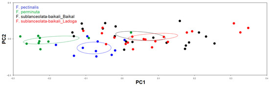 Table 5. Results * of NPMANOVA with pairwise comparisons for the allometrically-corrected PC1 and PC2 scores of studied Fragilaria populations (1 = F. sublanceolata-baikali from Lake Ladoga; 2 = F. sublanceolata-baikali from Lake Baikal; 3 = F. pectinalis; 4 = F. perminuta).