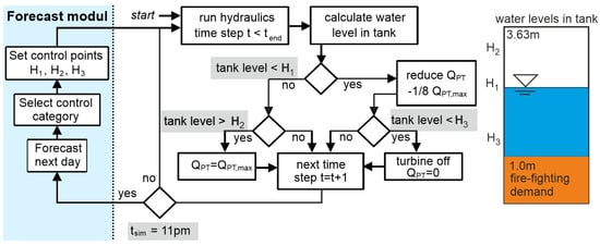 Figure 1 provides an overview of the developed control strategy. There are three defined water levels in the storage tank (H1, H2, and H3), which serve as operating levels for control actions: