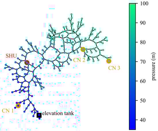 The analysis employs a calibrated numerical model described in [29], consisting of 243 nodes and 269 pipes, and is implemented in EPANET 2.2 [34]. The Python EPANET toolkit provided by Open Water Analytics (https://github.com/OpenWaterAnalytics/epanet-python/tree/dev/epanet-module, accessed on 14 August 2019) is applied for the extended period simulation covering the 10-year timeframe. The simulation accounts for water demand fluctuations by incorporating hourly and daily patterns derived from the empirical data. Additionally, three control nodes (marked as orange circles in Figure 2) are selected to ensure a minimum hydraulic head is always maintained. As the actual one-time minimum pressure without an SHPU in the network is approximately 21 m, the limit is set at 20 m, capturing significant deteriorations in the system without falsely eliminating the actual state. Further details on the case study can be found in [29].