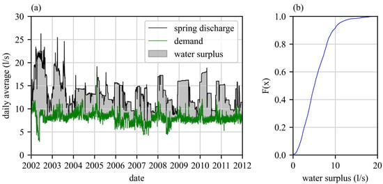 (a) Daily spring discharge and total water demand of the case study over the investigation period according to [21] and (b) cumulative distribution function of the water surplus usable for the SHPU.
