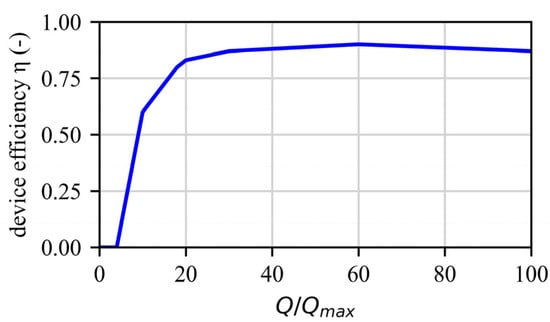 For the profitability analysis, assumptions from [29] are used for comparison: the generator efficiency ηG is assumed to be 0.95, and the device efficiency curve for the selected Pelton turbine is shown in Figure 4. The energy tariff is 0.1055 €/kWh, while the investment costs for the Pelton turbine and the additional expenses are assumed to be 3123 €/kW and 11,000 €, respectively. Furthermore, an annuity factor of 0.084 is applied, assuming an amortisation period of 15 years and a real interest rate of 3%.