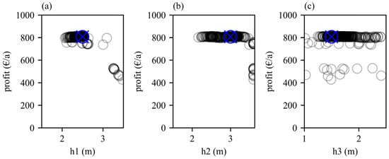 The robustness of the solution is further demonstrated in Figure 6, which showcases the relationships between annual profit and the magnitude of the operating levels for the best 100 solutions. The blue markers represent the operating levels of the reference scenario based on the empirical data. The x-axis is fixed according to the possible depths in the storage tank: h1 ranges from 1.5 to 3.5 m, h2 ranges from 1.5 to 3.63 m, and h3 ranges from 1.0 to 2.5 m. As observed in Figure 6b,c, a relatively high profit can be achieved without precise knowledge of the optimal ranges for H2 and H3. In contrast, H1 shows a tighter clustering of profitable settings between 2.0 and 2.7 m (Figure 6a) compared to the broader range of values for H2 and H3. Consequently, the selection of the filling depth from where the turbine inflow is gradually reduced has a greater impact on the results than the switch-off point or the switch-on point after water level regeneration.