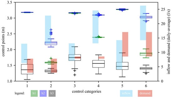 Figure 8 provides additional information by displaying the range of daily spring discharge (inflow) and total water demand (demand) for each control category as coloured light blue and light red boxes, respectively (secondary y-axis). Thereby, the average daily inflow is between 13 and 16 L/s for high spring discharge (categories 2, 4, and 6) and between 4 and 14 L/s for low spring discharge (categories 1, 3, and 5). In contrast, the water demand is between 3 and 7.5 L/s for low water demand (categories 1 and 2), between 7.5 and 8.5 L/s for medium water demand (categories 3 and 4), and between 8.5 and 17.0 L/s for high water demand (categories 5 and 6). As the water demand is roughly normally distributed, the range for water consumption for the medium water demand is relatively narrow compared with other categories. Additionally, the optimisation results for the three operating levels are represented as boxplots for each control category, indicated by green, blue, and black colours for H1, H2, and H3, respectively (primary y-axis). The boxplots show the results of the best 100 different triples, whereas the values for H1 vary between 1.55 and 3.25 m, for H2 vary between 2.10 and 3.30 m, and for H3 vary between 1.05 and 2.10 m within these triples. For more details, the correlations of the different operating levels for the best 100 results per category are illustrated in Figure 9. Figure 9a for H1 and H2; Figure 9b for H1 and H3; and Figure 9c for H2 and H3).