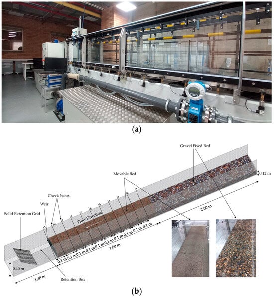 Natural rivers, mainly in areas with little intervention, flow over a bed or sediments deposited by dragging and deposition due to their size and environment. These are called alluvial rivers and present variable granulometric conditions, which vary in gravel composition (with an average diameter of 2 mm), variable percentages of sand (with an average diameter of 0.1 mm), and slopes greater than 0.5% [,]. Likewise, they present a Coefficient of uniformity (Cu) greater than 20, which indicates that the sediment is well-graded and homogeneous in composition [,].