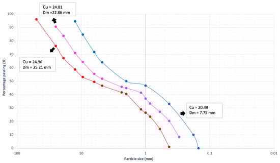 Figure 2 shows the Coefficient of Uniformity (Cu) for the granulometric curves. The data showed values between 24.96 and 24.81 with a median diameter of 35.21 and 22.86 mm, respectively. These curves were scaled to generate the theoretical granulometric curve with a Cu of 20.49 and an average diameter of 7.75 mm, obtained through the d60/d10 ratio. According to the results, the necessary volumes of fine sand, coarse sand, and gravel were obtained (46, 26, and 28%, respectively).