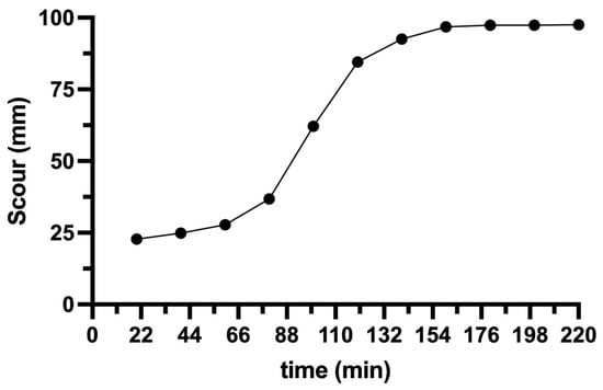 After 160 min, the start of a constant scour is observed. Another 60 min were added to demonstrate the linearity of the values of maximum scour depth, with an average value of 97 up to a maximum value of 97.5 in the analysis conducted between 200 and 220 min. With the implemented diameters (Figure 3) and channel depth, the necessary conditions were fulfilled to exclude viscosity and macro roughness effects, which are diameters larger than about 0.9 mm and flow depths above 20 mm [].