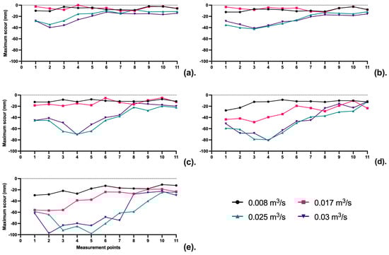 Maximum scour measurements for the eleven control points for different discharges and slope configurations. slope = 0.5% (a), slope = 1% (b), slope = 1.5% (c), slope = 2% (d), and slope = 2.5% (e).