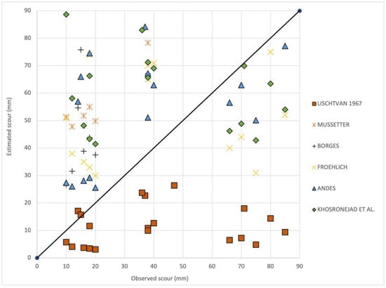 Table 2 shows the statistical analysis for comparing the equations to predict scour. In this analysis, the proposal from Aguirre-Pe et al. [] was considered and error correction was conducted to establish a maximum acceptable value of 200 for the MNE. The result allowed a representative margin for the proposed mathematical equation to improve the prediction of maximum scour. Data showed that the novel equation obtained an MNE of 68.72%, which was only surpassed by Lischtvan–Lebediev’s equation [] (MNE of 63.03%). Likewise, it can be observed that the equations from Khosronejad et al. [], Froehlich [], and Mussetter et al. [] tend to overestimate scour, as they exceed the initially proposed value for the MNE. On the other hand, although the Pereira [] and Borges [] equations deliver MNE values within the suggested range, their results tend to underestimate the calculated scour.