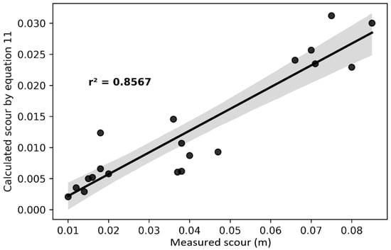 Lineal regression of the results of the proposed equation and the experimental data to estimate the maximum local scour.