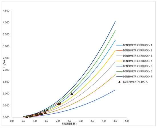 Figure 7 shows a three-variable diagram depicting the dimensionless relationship among critical variables: the Froude number (Fr), the densimetric Froude number (Frd), and the dependent variable, scour depth (Hs), relative to flow depth (Yn). This diagram facilitates the calculation of scour depth as a function of the Froude number, which was subsequently validated against experimental data obtained from physical models representing well-graded granular beds and longitudinal structures.