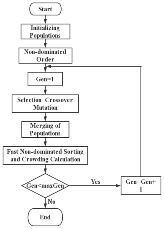 The basic idea of the algorithm is as follows: First, initialize the population, randomly generate a parent population with a size of N, and then obtain the first generation of the offspring population through the three basic operations of a genetic algorithm, namely, selection, crossover, and mutation, after carrying out non-dominated sorting. Then, merge the parent population with the offspring population (at this time, the size of the population is 2N); carry out rapid non-dominated sorting while, at the same time, carrying out the crowding calculation for the individuals in each non-dominated layer; and select suitable individuals according to the non-dominance relationship and the size of the congestion distance to select the appropriate individuals with which to form a new parent population with a size of N. Finally, the basic process of the genetic algorithm is used to generate a new offspring population, and this step is executed repeatedly until the conditions for initiating the end of the program are met. A flowchart of the algorithm is shown in Figure 2.