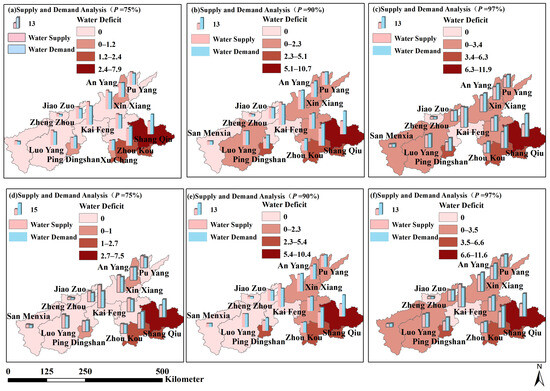 Spatial map of supply and demand balance analysis of Henan Yellow River water supply zone in the forecasted year: (a–c) represent the results of the 2025 supply-and-demand balance analysis, while (d–f) represent the results of the 2030 supply-and-demand balance analysis.
