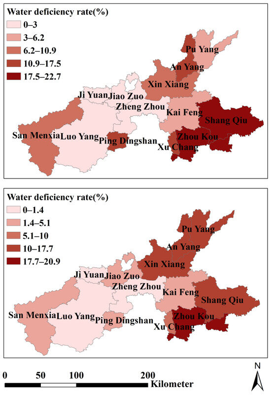 Spatial map of agricultural water shortages in the Yellow River water supply zone of Henan in the forecasted years.