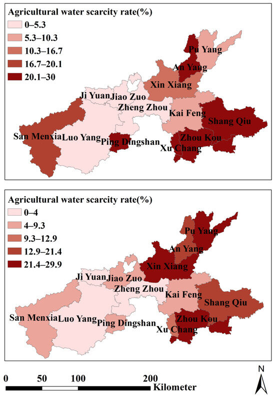 - In 2025, the average water scarcity rate in the study area will be 9.69%, while in 2030, it will decrease to 8.34%. Water resource allocation for the different forecasted years can adequately meet the demands of domestic, industrial, and ecological and environmental use. The primary issue is related to water scarcity in agriculture. There is still substantial potential for water conservation in agriculture, which can be achieved through implementing measures such as enhancing irrigation system infrastructure, optimizing crop planting structures, and improving irrigation methods.