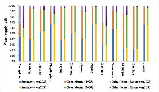 In Figure 6, it can be observed that the main water source for water supply in Kaifeng, Anyang, Shangqiu, and Zhoukou is groundwater. In 2025, the proportions of groundwater supply for these cities will be 55.39%, 58.22%, 63.41%, and 77.78%, respectively. In 2030, these proportions are 52.74%, 55.78%, 59.54%, and 76.11%, respectively. Among these cities, Zhoukou has the highest proportion of groundwater supply (77.78% in 2025 and 76.11% in 2030). Zhengzhou, Luoyang, Pingdingshan, Sanmenxia, and Jiyuan mainly rely on surface water for water supply. In 2025, the proportions of surface water supply for these cities will be 43.71%, 53.21%, 66.85%, 57.98%, and 66.24%, respectively. In 2030, the proportions of surface water supply for these cities will be 44.37%, 54.16%, 66.32%, 57.98%, and 65.80%, respectively. Among the studied cities, Pingdingshan has the highest proportion of surface water supply (66.85% in 2025 and 66.32% in 2030). Conversely, Xinxiang city has relatively similar proportions of surface water and groundwater supply, with values of 49.82% and 50.18% in 2025 and 51.92% and 48.08% in 2030. Zhengzhou and Xuchang have relatively high utilization rates of other water sources, reaching 32.73% and 30.19% in 2025 and increasing to 40.04% and 35.64% in 2030, respectively.