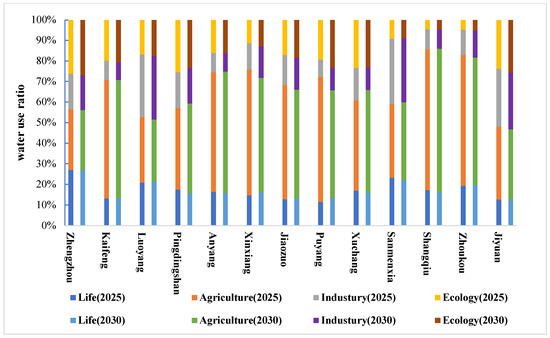 Due to the rapid socio-economic development in the research area, overall water usage is on the rise. When considering different user segments, water usage for domestic and industrial purposes is increasing. The trends in total water demand for the forecasted years in Henan province are consistent with the predictions made by Ji et al. [41]. As shown in Figure 7, Zhengzhou has the highest level of domestic water usage, with proportions of 26.92% and 26.79% for the different forecasted years. Conversely, Jiyuan has the lowest domestic water usage percentages, with proportions of 12.55% and 12.58%. Luoyang exhibits the highest level of industrial water usage, with proportions of 30.52% and 30.87% for the different forecasted years. The cities with the lowest industrial water usage proportions are Puyang (8.35% in 2025) and Kaifeng (8.52% in 2030). The ecological environment is closely related to residents’ livelihoods, and people are increasingly pursuing ecological benefits. The proportion of water usage for the ecological environment is also on the rise. This is consistent with the results obtained by Zhang et al. [42], who analyzed the trend of ecological water use in Chongqing. Among the analyzed areas, Zhengzhou has the highest levels of ecological water usage, with proportions of 26.18% and 26.95% for the different forecasted years. Conversely, Shangqiu has the lowest levels of ecological water usage, with proportions of 4.55% and 4.56%. With the improvement of agricultural water-saving measures, the proportion of water used in agriculture is decreasing. However, being an agricultural powerhouse, agriculture still remains the dominant sector with respect to water usage in Henan Province. Among the studied cities, Shangqiu has the highest proportion of water usage for agriculture, with percentages of 68.40% and 69.62%. Conversely, Zhengzhou has the lowest proportion of water usage for agriculture, with percentages of 29.67% and 29.38%. With the improvement of agricultural water-saving measures, the proportion of water used in agriculture is decreasing. However, being an agricultural powerhouse, agriculture still remains the dominant sector in terms of water usage in Henan Province. Among the cities, Shangqiu has the highest proportion of water usage for agriculture, with percentages of 68.40% and 69.62%. Conversely, Zhengzhou has the lowest proportion of water usage for agriculture, with percentages of 29.67% and 29.38%.
