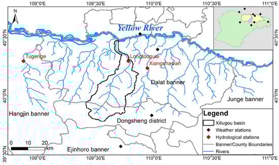Situated within the Ten Kongduis basin in Ordos and positioned on the right bank of the Yellow River, the Xiliugou basin occupies a central location, with its specific coordinates being E109°24′~110°00′ and N39°47′~40°30′ (Figure 1). The control area above Longtouguai hydrological station is 1157 km2, and the altitude varies from 1044 to 1551 m. The Xiliugou basin experiences a semi-arid continental climate, characterized by lengthy cold winters and brief hot summers. The average annual temperature within the basin is approximately 6 °C, the average annual wind speed is 3.7 m·s−1, the annual rainfall is 240–360 mm, and the potential evaporation is 2200 mm. The distribution of rainfall and runoff within this basin exhibits seasonal variations with uneven patterns throughout the year. Notably, during the flood season (June–September), the rainfall accounts for approximately 82% of the total annual precipitation. The rainfall in the flood season tends to be concentrated and takes the form of heavy rain, resulting in sharp changes in the flood level. It serves as a critical source of coarse sand in the Yellow River, China. In recent decades, several strategies have been employed to promote vegetation restoration in the basin, such as the implementation of soil and water conservation techniques and the conversion of agricultural land into forested or grassy areas. These endeavors have led to a remarkable growth in vegetation coverage within the region. As a result, there has been a noticeable alteration in land use and cover, leading to a substantial decrease in both runoff and sediment [].