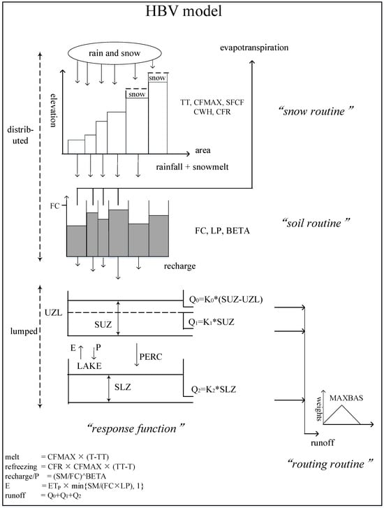 The HBV model structure is mainly composed of a snow melting module, a soil moisture module, and a production confluence module. The specific model structure is shown in Figure 2.