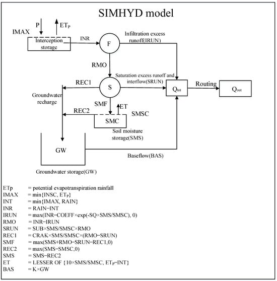The Hydrologiska Byrans Vattenbalansavdelning (HBV) hydrological model [] and SIMulation of HYDrology (SIMHYD) [,,,,] are two conceptual precipitation runoff models. These models exhibit their proficiency in establishing the connections between precipitation, evaporation, and runoff. Moreover, they integrate modifications in soil, water and groundwater processes using a set of precise mathematical equations. These equations form the basis for accurately simulating and analyzing the intricate dynamics of a hydrological system.
