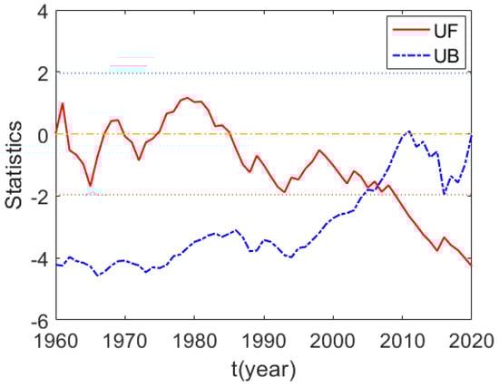 The widely employed nonparametric Mann–Kendall (MK) method [,] has found extensive application in the analysis of trends and sudden shifts in hydrometeorological time series. In this study, the MK method was applied to estimate annual runoff trends and abrupt points in the Longtouguai hydrological station.