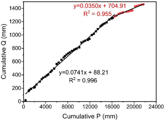 The precipitation–runoff DMC in the Xiliugou basin was generated based on the identified abrupt change points (refer to Figure 5). The analysis confirmed the validity of the detected abrupt change point in 2006.