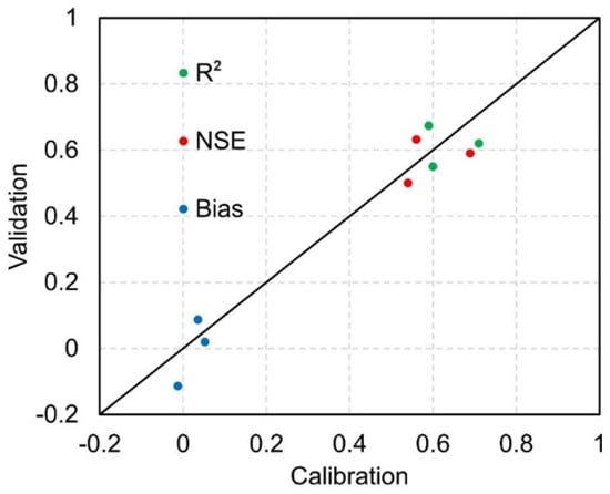 During the calibration and validation processes, a comprehensive objective function, denoted as F, was implemented in SWAT-CUP Premium. This function incorporated multiple evaluation metrics, including R2, the Nash–Sutcliffe efficiency (NSE) [], and Bias. By integrating these diverse criteria, the objective function facilitated a thorough assessment of the model’s performance and enhanced the reliability of the results. Simultaneously considering multiple aspects of model accuracy, precision, and bias, this approach provided a robust framework for both the calibration and verification stages: