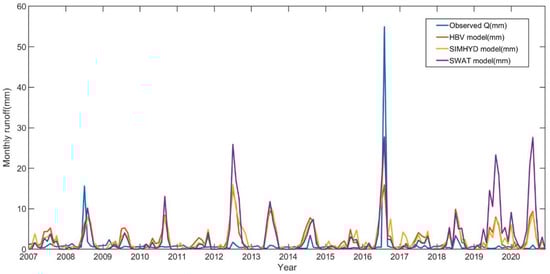 The simulated monthly runoff process lines by the three hydrological models and measured monthly runoff process line during 2007–2020.