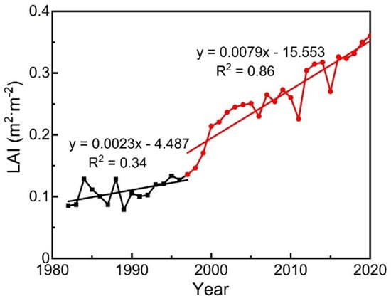 Annual LAI changes in Xiliugou basin from 1982 to 2020.
