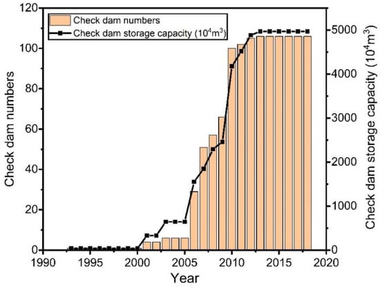 The temporal variation in the annual count and storage of check dams in the Xiliugou basin.