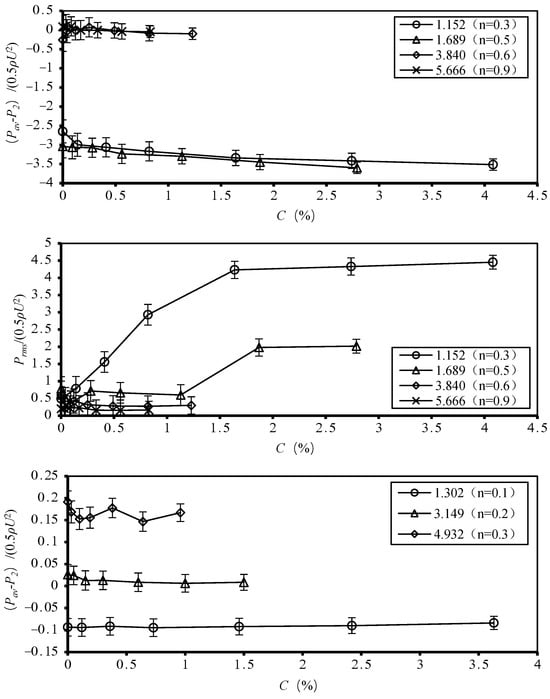 The variation in the flow coefficient with respect to the aeration concentration is shown in Figure 5. At different flow rates, the flow coefficient decreases with increasing aeration concentration, but the rate of decrease becomes slower. Under the same aeration concentration, a larger flow velocity produces a more obvious drop in the flow coefficient. From its definition, the flow coefficient is proportional to the flow rate and inversely proportional to the pressure difference. The test results show that the forced air intake in front of the valve produces a certain resistance to the incoming flow. This enforces a reduction in the flow rate over the valve, which enhances the pressure in front of the valve. The pressure behind the valve also increases, but to a lesser degree than that before the valve. Thus, the pressure difference continues to increase, and the flow coefficient continues to decline. With an increase in air content, the flow coefficient decreases continuously. This is because the pressure in front of the valve does not increase simultaneously with the increase in air content, and so the flow coefficient exhibits a relative decrease. Under the test conditions considered in this study, the maximum air content was 3 m3/h, the flow rate v ranged from 1.152 to 5.666 m/s, and the air content C varied from 0% to 4%. The maximum reduction in the flow coefficient was less than 5%, indicating that the air content has little effect on the flow coefficient.