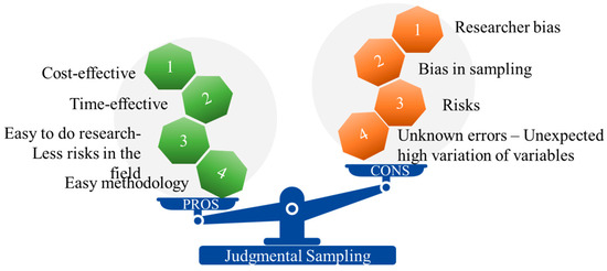 The determination of groundwater quality and quantity monitoring networks is crucial to conducting accurate research at a low cost and time [29,30]. Vast sampling points and/or generic random sampling are high-cost methods and rely less on prior specific knowledge. On the other hand, in judgmental sampling, the hydrogeologists have to analyze general and detailed information about the area and select the optimum sampling campaign, minimizing the limits and biases that affect the reliability of the findings [31]. The main positive and negative effects of this method are provided in Figure 2. The weight of each effect may vary between regions, while each sampling campaign should be organized based on the results of the previous ones. By employing this cost-effective and time-efficient method, the researcher can gain useful insights by selecting the most representative points considering various site-specific factors and research queries (Table 1). The combination of multiple analysis techniques can improve the representativeness of the samples and provide accurate and reliable research outcomes. The main drawbacks are the unknown errors that can be detected after the chemical analysis and the scarce availability of previous hydrogeological analyses in less well-known areas.