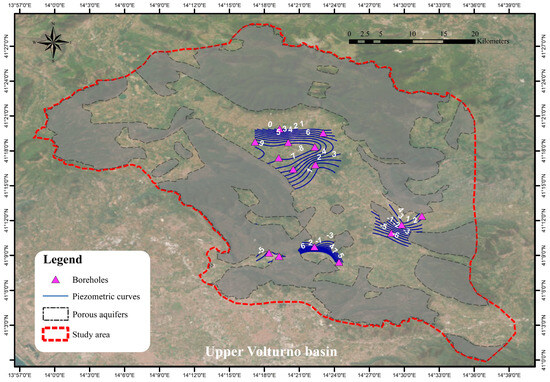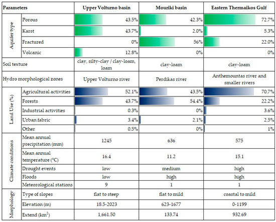 The decision to combine the Anthemountas basin with the coastal part as a unified research area was driven by two main factors: (i) the hydrogeological connection of these systems and (ii) the great amount of previous data. The Mouriki basin (Greece) is in Macedonia Province and covers an area of 100 km2. The Volturno basin (Italy) is located in the Campania region and covers an area of 5613 km2, while the extent of the study area considered is around 1661 km2. The Upper Volturno–Calore basin is characterized mainly as strongly asymmetric with steep slopes. This study focused on the outlet of the Upper Volturno–Calore basin to assess the potential interaction between the river and the groundwater in the alluvial plain.