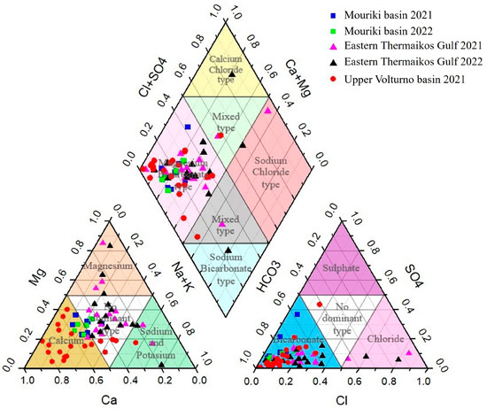 Basic statistical analysis was practiced as a first step to investigate the hydrochemical conditions of the study areas. The basic statistics of the groundwater quality parameters are summarized in Table S1. The geochemical evolution of groundwater can be recognized by plotting the concentrations of major cations and anions in a Piper diagram [38]. On average, the cation concentrations of groundwater in Eastern Thermaikos Gulf (TG) were in the order Ca2+ > Mg2+ > Na+ > K+, and those of the anions were in the order HCO3− > Cl− > SO42− > NO3−. In the other two areas, the order is almost similar: Ca2+ > Mg2+ > Na+ for cations and HCO3− > SO42− for anions (Figure 4). No significant variations are noted during the wet and dry period of 2021–2022 in the Mouriki basin and TG.